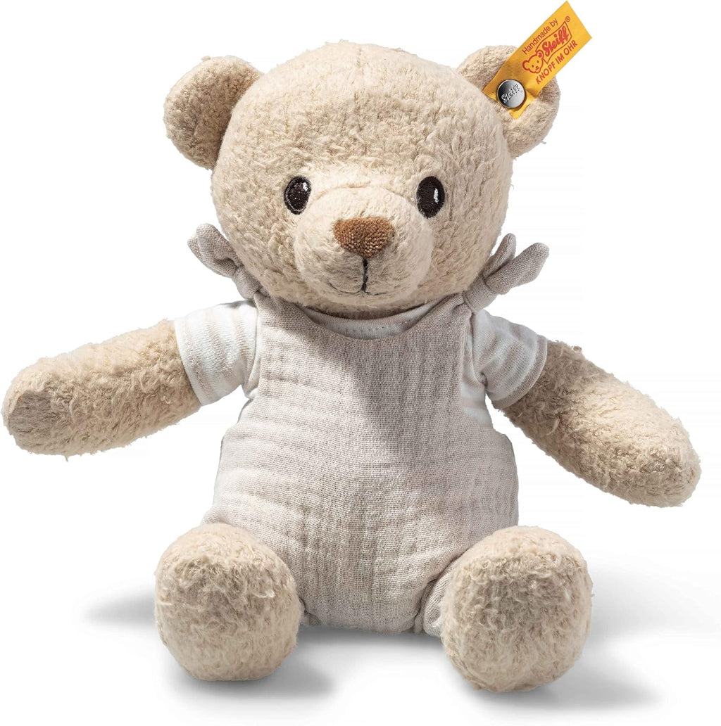 Steiff Noah GOTS Certified Teddy Bear, crafted from organic, certified materials. This loyal cuddle buddy combines Steiff's legendary quality with eco-conscious design, featuring the iconic "button in the ear" that guarantees superior craftsmanship and safety standards. Machine washable for effortless care, Noah grows alongside your child as a cherished friend for life. 26cms
