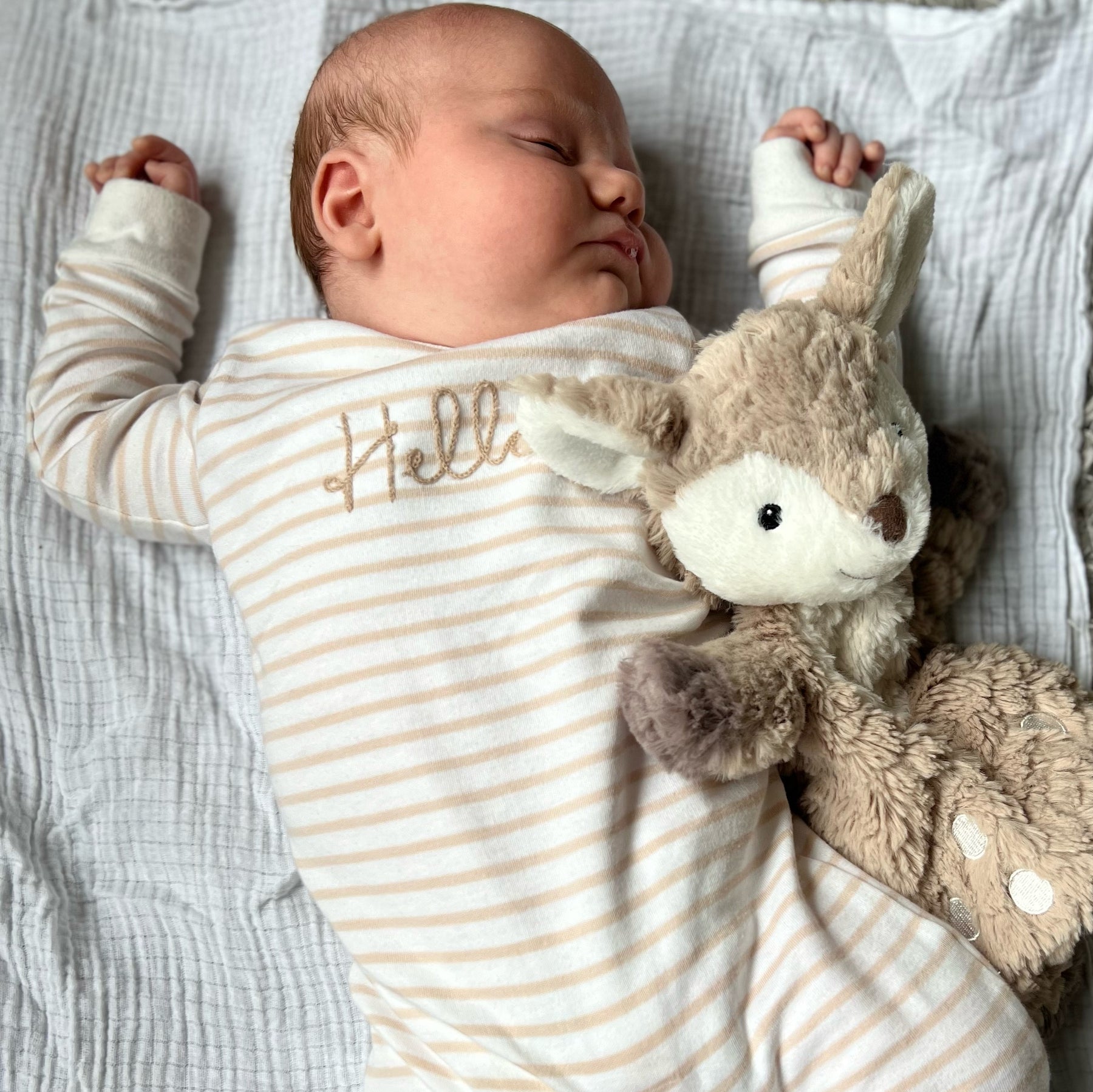 Putty Nursery is known for its luxurious fabrics, and this gorgeous fawn lovely is no exception. The neutral colour palettes make this a perfect baby boy gift or baby girl gift. This soft squish toy is half comforter/half soft toy and is perfect for tiny hands to grasp.