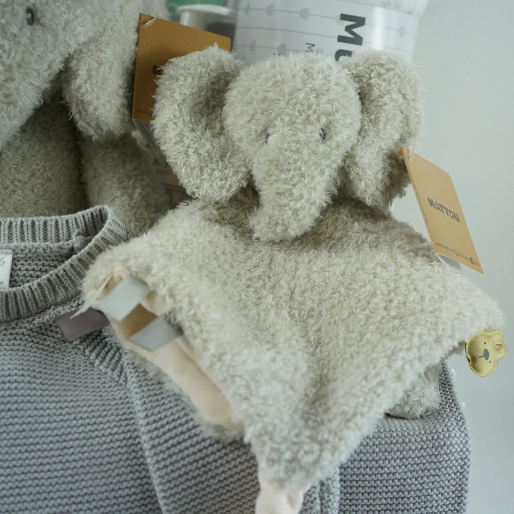 Grey Elephant Neutral Baby Hamper, Nattou Elephant And Comforter, Baby Knitted Set