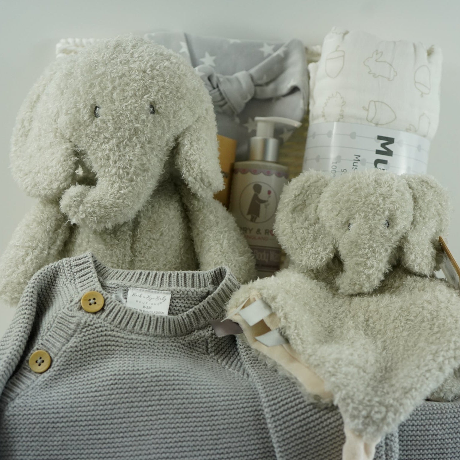 Discover the perfect neutral baby shower gift with our Grey Elephant Hamper, thoughtfully curated for welcoming a new arrival. This comprehensive baby gift set features a charming Nattou elephant companion, a soft comforter, and a beautifully knitted baby all presented in calming grey tones. Ideal for parents expecting a baby girl or boy, this hamper combines practical baby essentials with adorable keepsakes that celebrate this special milestone. Each item has been selected to provide comfort and joy during those precious early months. Whether you're searching for a meaningful baby shower present or a heartfelt welcome gift for new parents, this elegant hamper delivers everything needed to make a lasting impression.