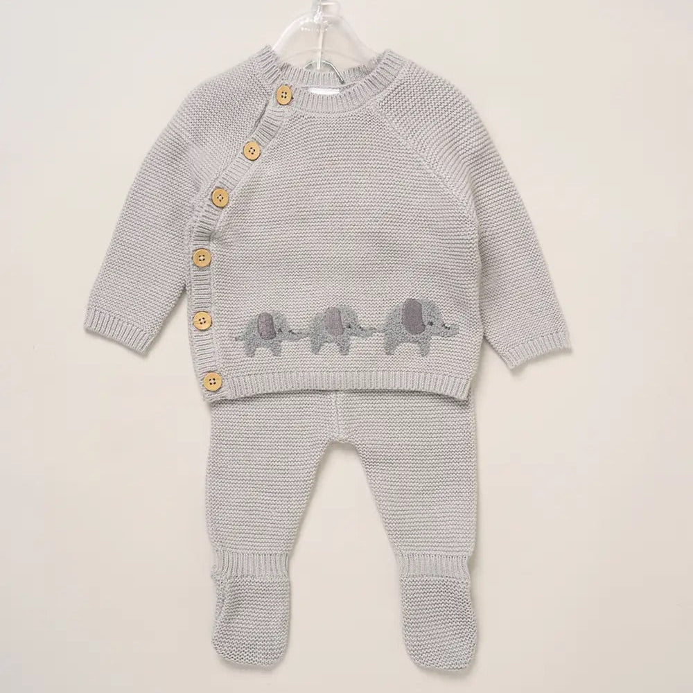 Grey elephant true knit jumper set features a jumper with an adorable elephant print and asymmetric button fastening, and matching pair of footed trousers. This stylish set ensures little one stays cosy and fashionable, making it the perfect baby gift