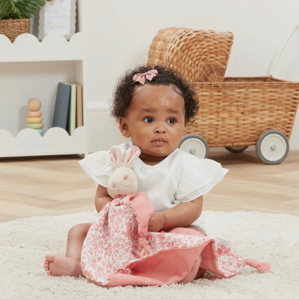 A soft muslin baby comforter featuring Flopsy Bunny from the Peter Rabbit Signature collection.