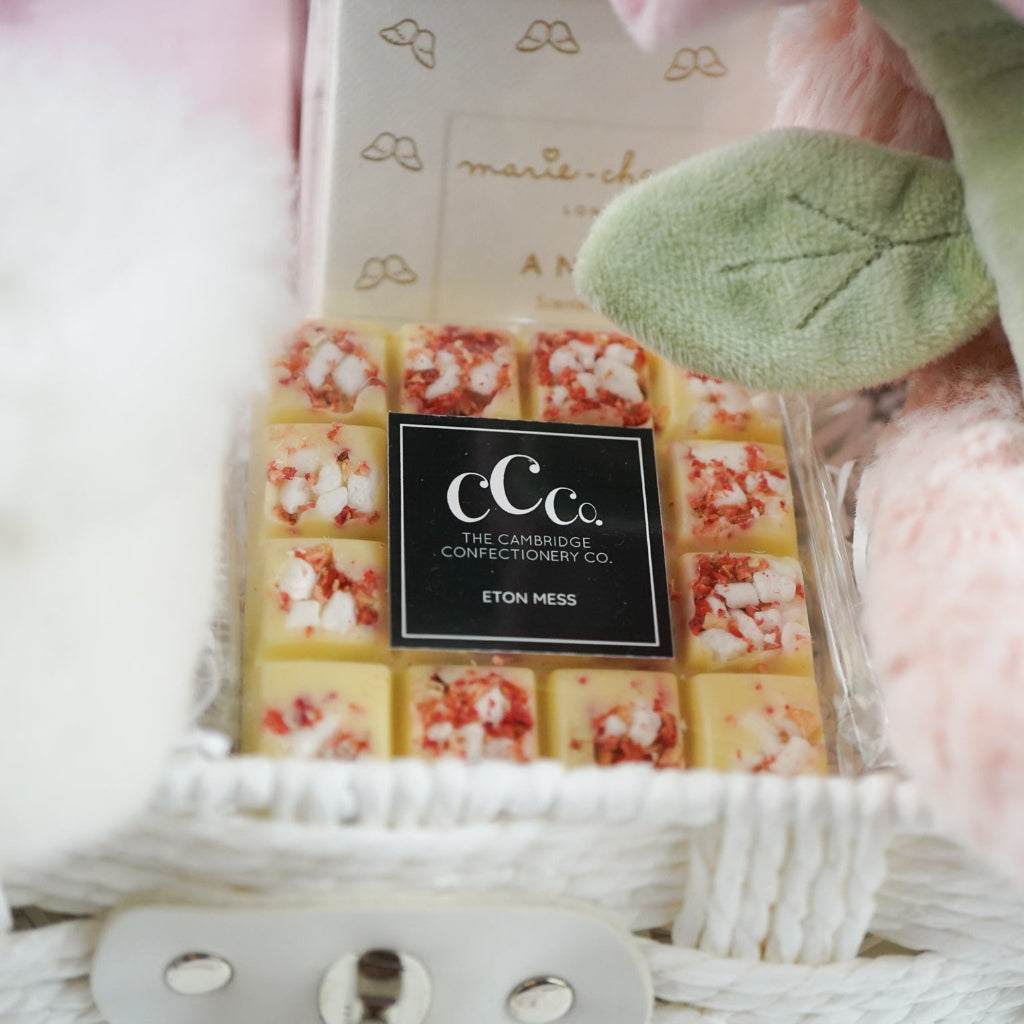 Eton mess white chocolate bar. A Luxury, Chunky White Chocolate Square Bar Brimming with Freeze Dried Strawberries and Crispy Meringue Pieces100g Vegetarian | Palm Free. The perfect treat for a new parent.