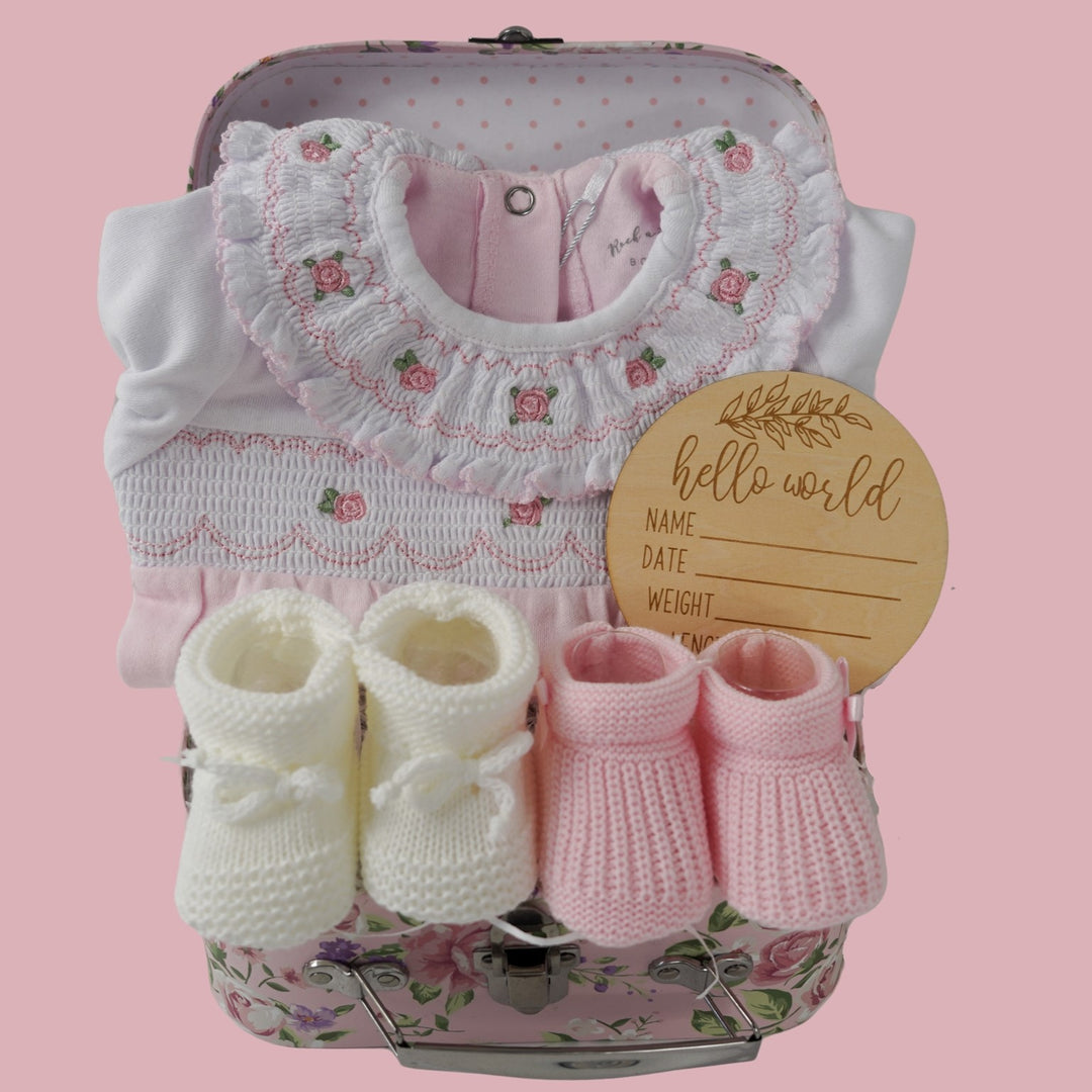 Choose a luxury baby girl hamper from our unique range of baby girl gifts packed full of useful newborn baby girl presents, including stunning baby girl outfits, soft toys and thoughtful baby essentials. Our baby girl gifts make unforgettable baby shower presents and stunning corporate baby gifts. These stunning baby girl hampers are perfect to celebrate a new arrival and are carefully packaged ready for gifting to the new parents. We will send your new baby girl hamper basket via a tracked delivery with a hand written gift card with your personal message beautifully presented ready for gifting. Choose a new baby hamper basket, gift box set, nappy caddy, or keepsake baby suitcase from our exclusive range of new baby girl presents.