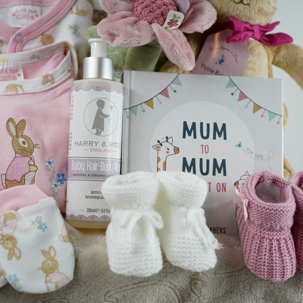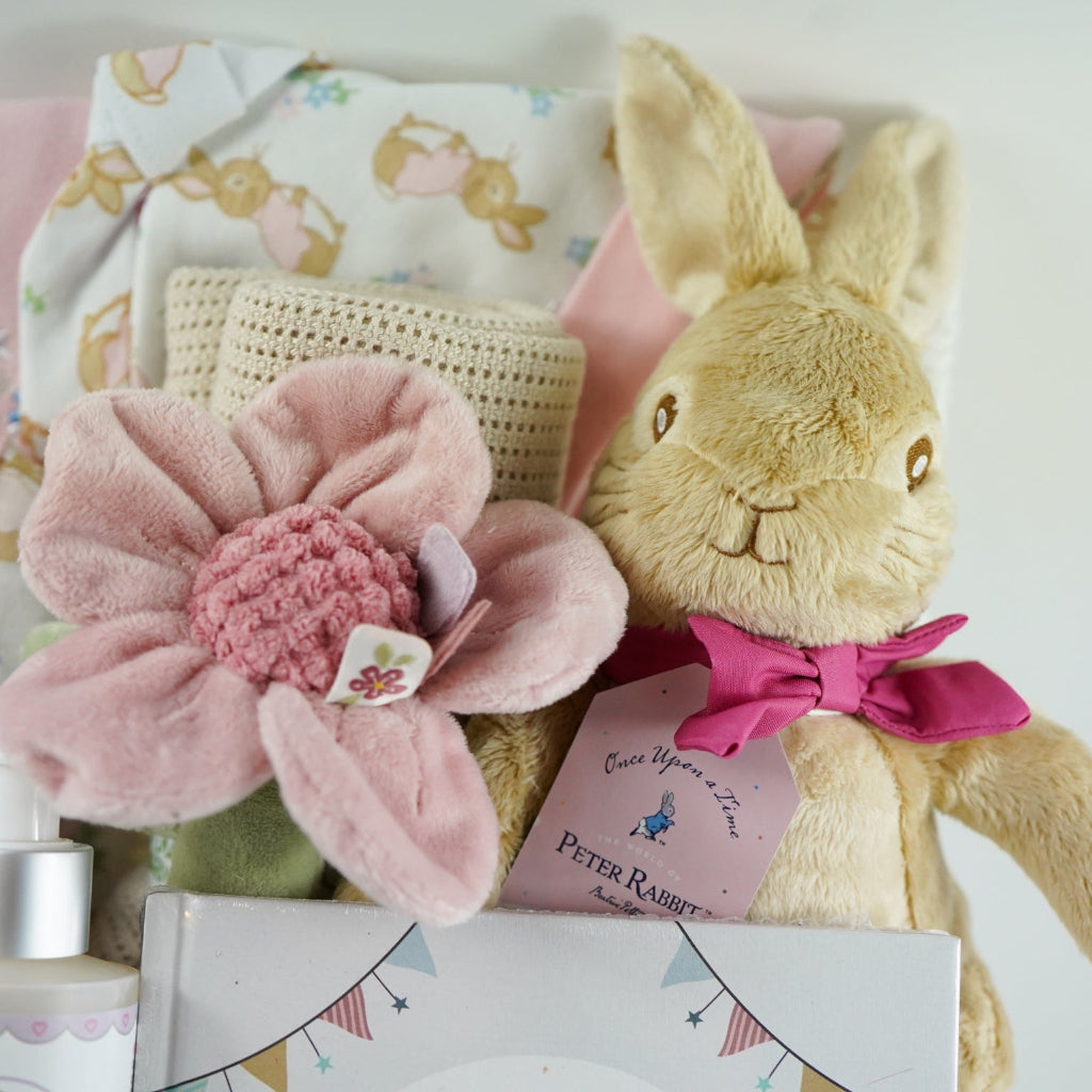 Welcome a precious new arrival with this enchanting Beatrix Potter-inspired hamper basket, thoughtfully curated with everything parents need during those early months. This delightful gift set combines practical baby essentials with charming keepsakes, featuring a beloved Flopsy Bunny soft toy that will become a cherished companion. From nursery staples to adorable accessories, each item has been selected to support new parents while celebrating the magic of welcoming a baby girl. Perfect for baby showers, new parent gifts, or a special way to mark this momentous occasion with style and sentiment.