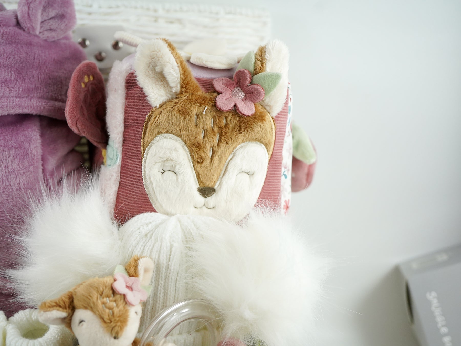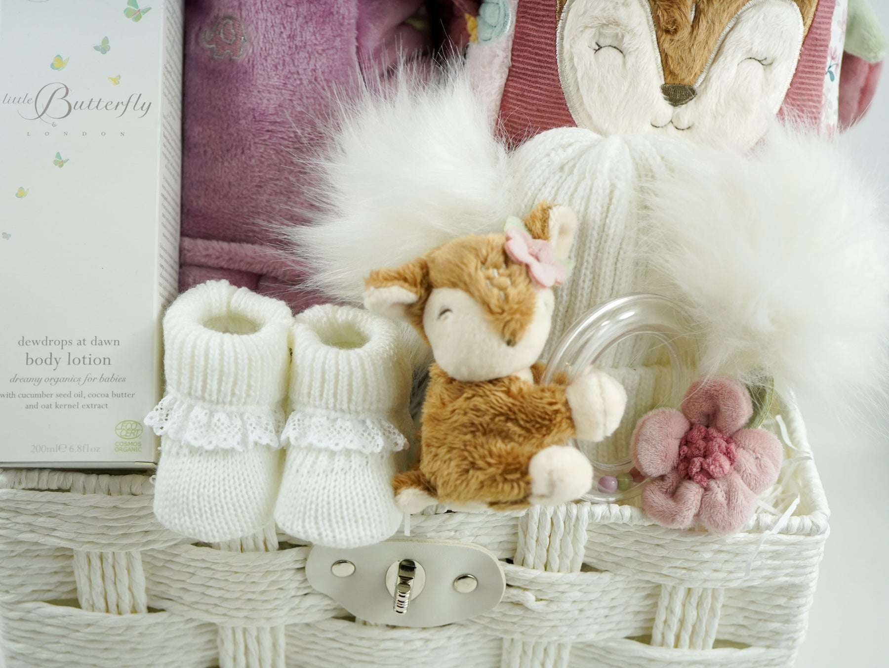 These gorgeous baby girl gifts come beautifully presented in our white paper rope hamper basket which makes a wonderful keepsake box. We tie this with a ribbon and include a gift tag which you can personalise yourself or we can handwrite your message going direct to the recipient.