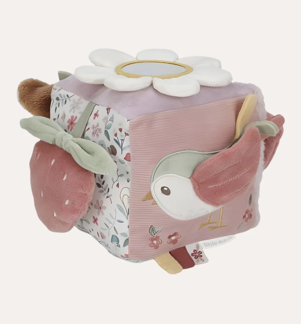 Fairy Garden soft activity cube. Let a little on explore the Fairy Garden where the deer, bird and butterfly live and play. Rendered in an array of appealing hues, this super-soft activity cube will trigger your baby’s curiosity. Every side features a different activity and is dressed in various textures, shapes and stimulating features. The cube can be grasped and rotated and comes with a blooming mirror for self discovery. It makes for endless entertainment while developing your child’s senses. Recommended age - From Birth.